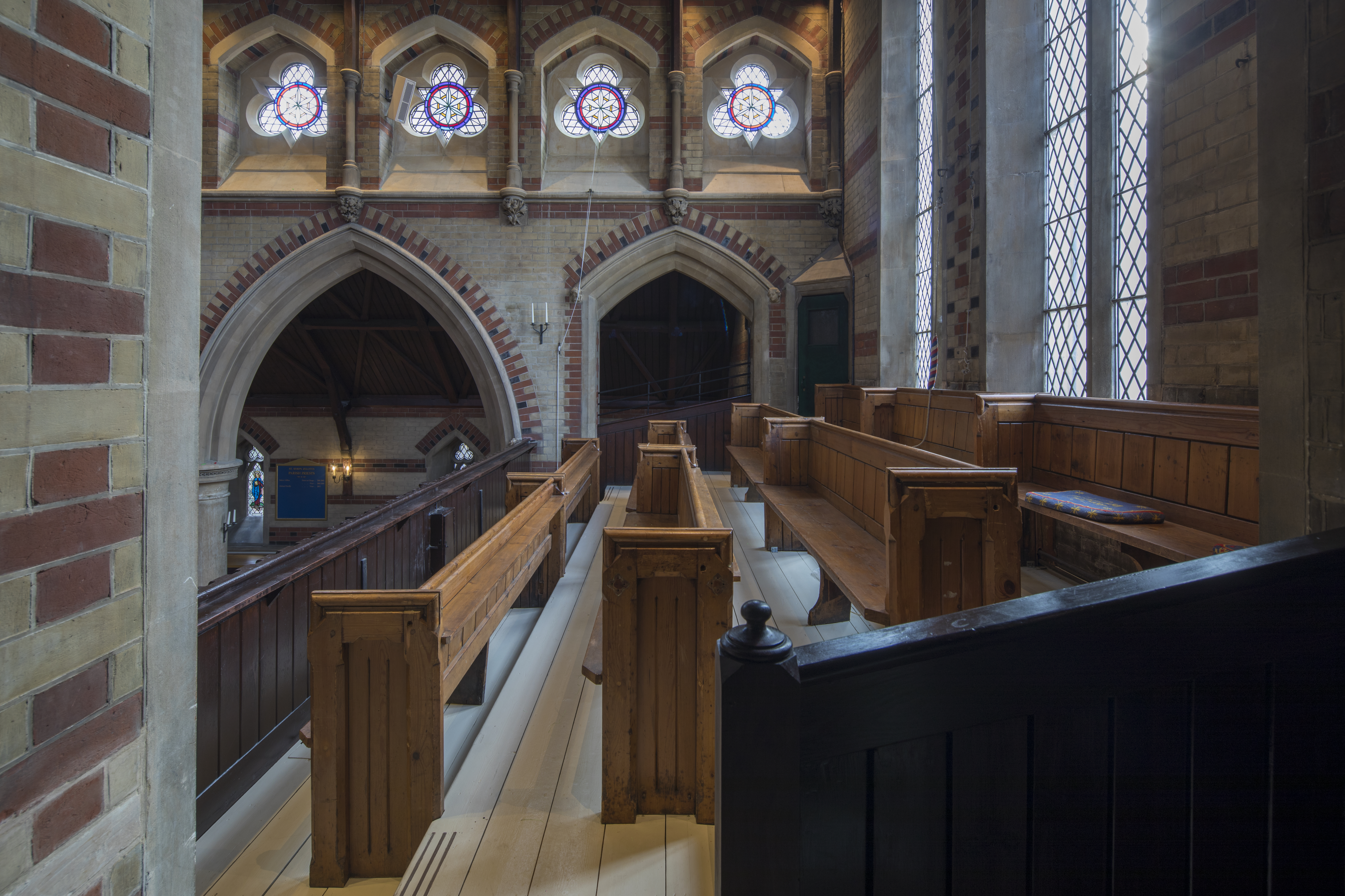 Designed by Joseph Peacock in 1851, St Simon Zelotes is a striking and distinctive church built in the High Victorian tradition. It has a Kentish Rag Stone exterior and an impressive polychrome brick interior with abundant carving by John Lewis Jacquet. It is Listed Grade II*. Several alterations to the interior have been made in recent years to meet the needs of a modern church. Although extensive in parts, these have been done to blend into Joseph Peacock’s interior and to look as if they are a natural part of the design. The works were carried out by Quinlan Terry Architect.